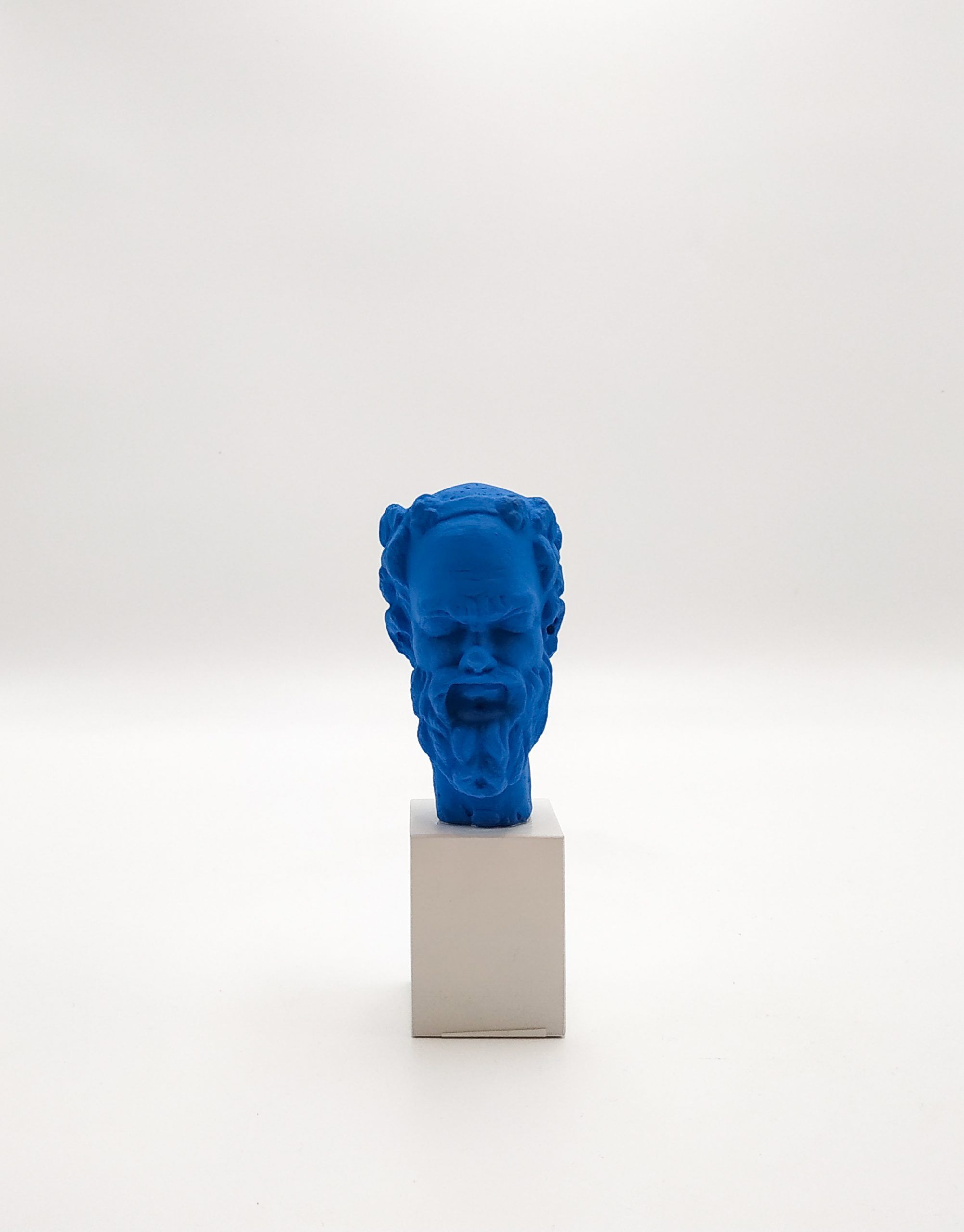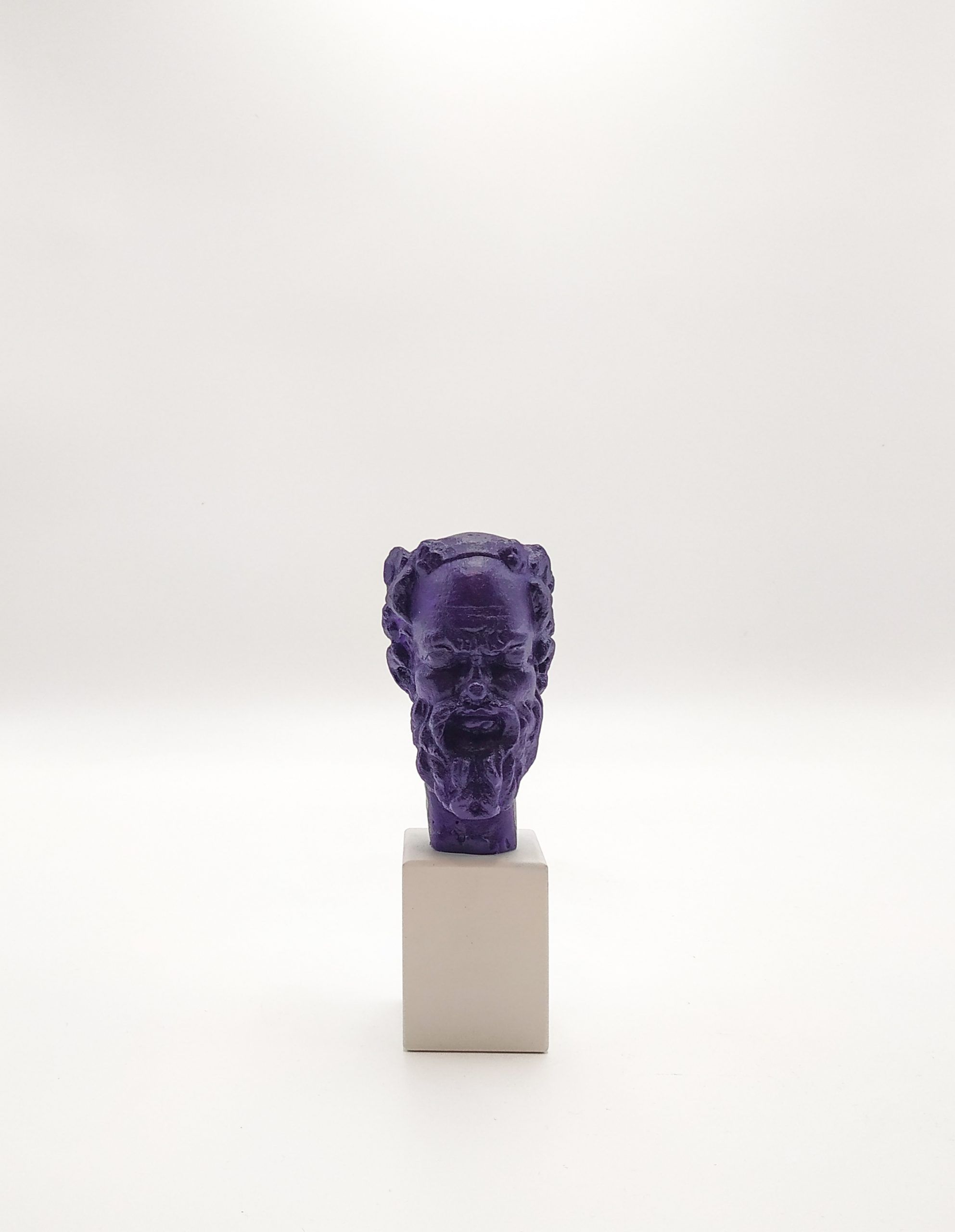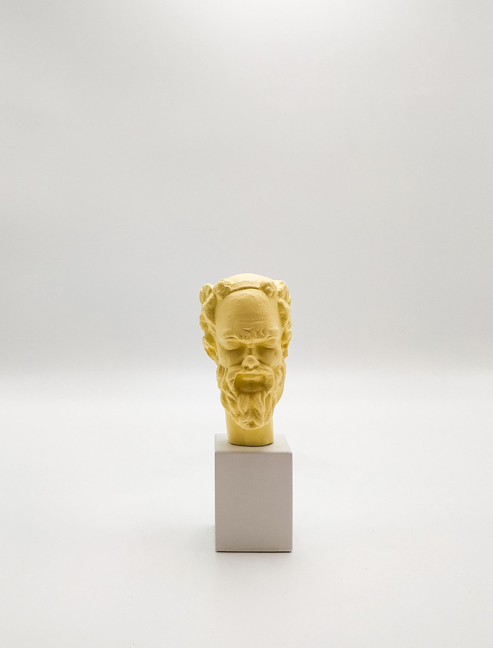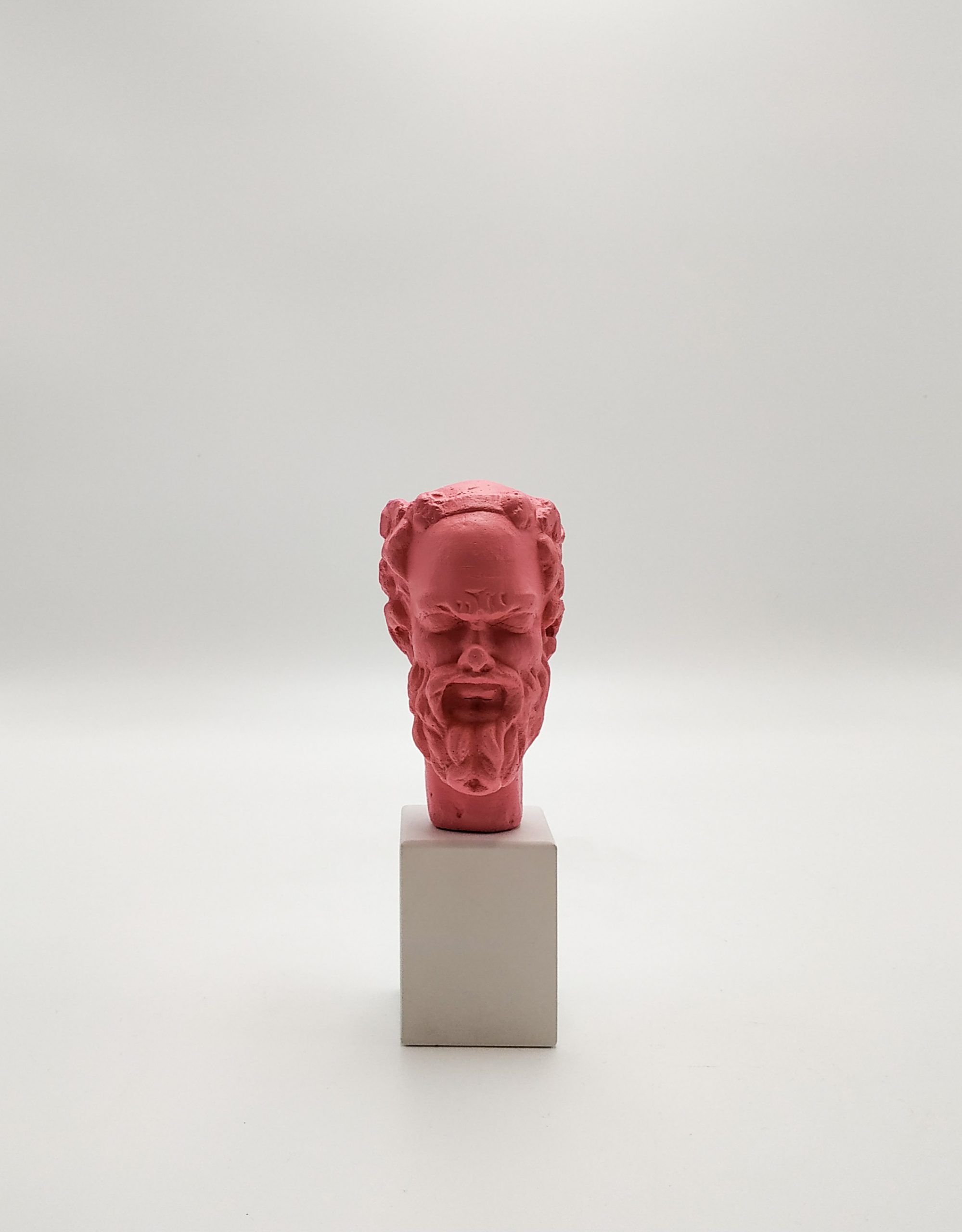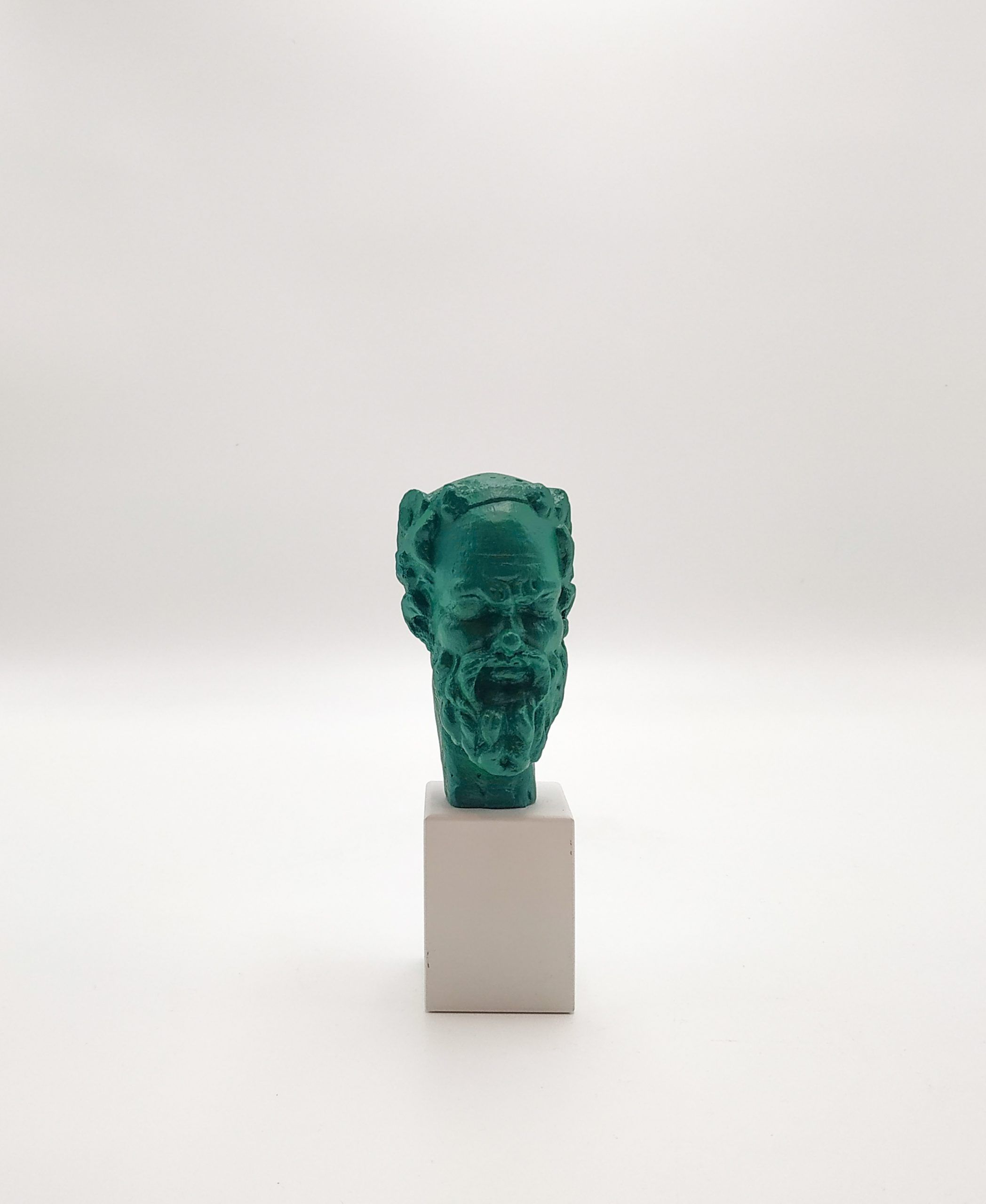 Sileno. Cabeza sobre peana de madera. Colores variados.